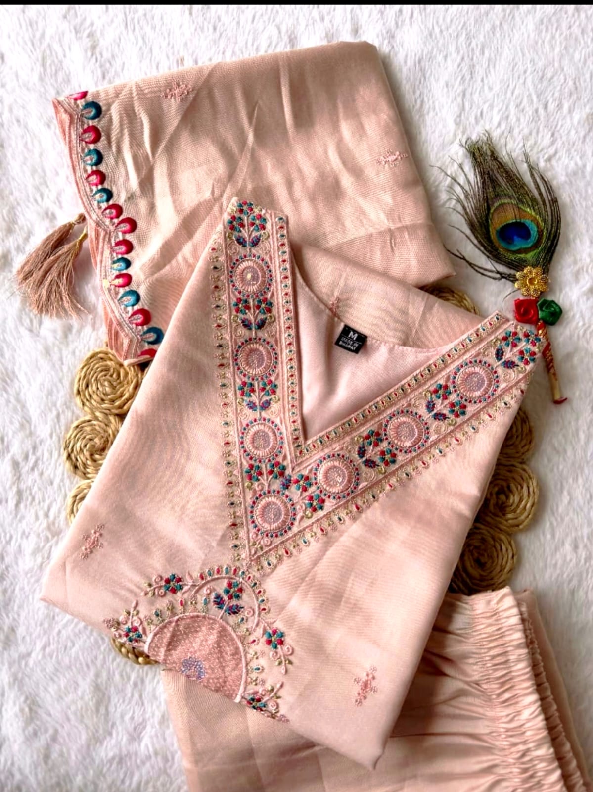 The Dupatta: A standout accessory featuring heavy double-sided embroidery with vibrant scalloped edges and decorative tassels for a premium finish.