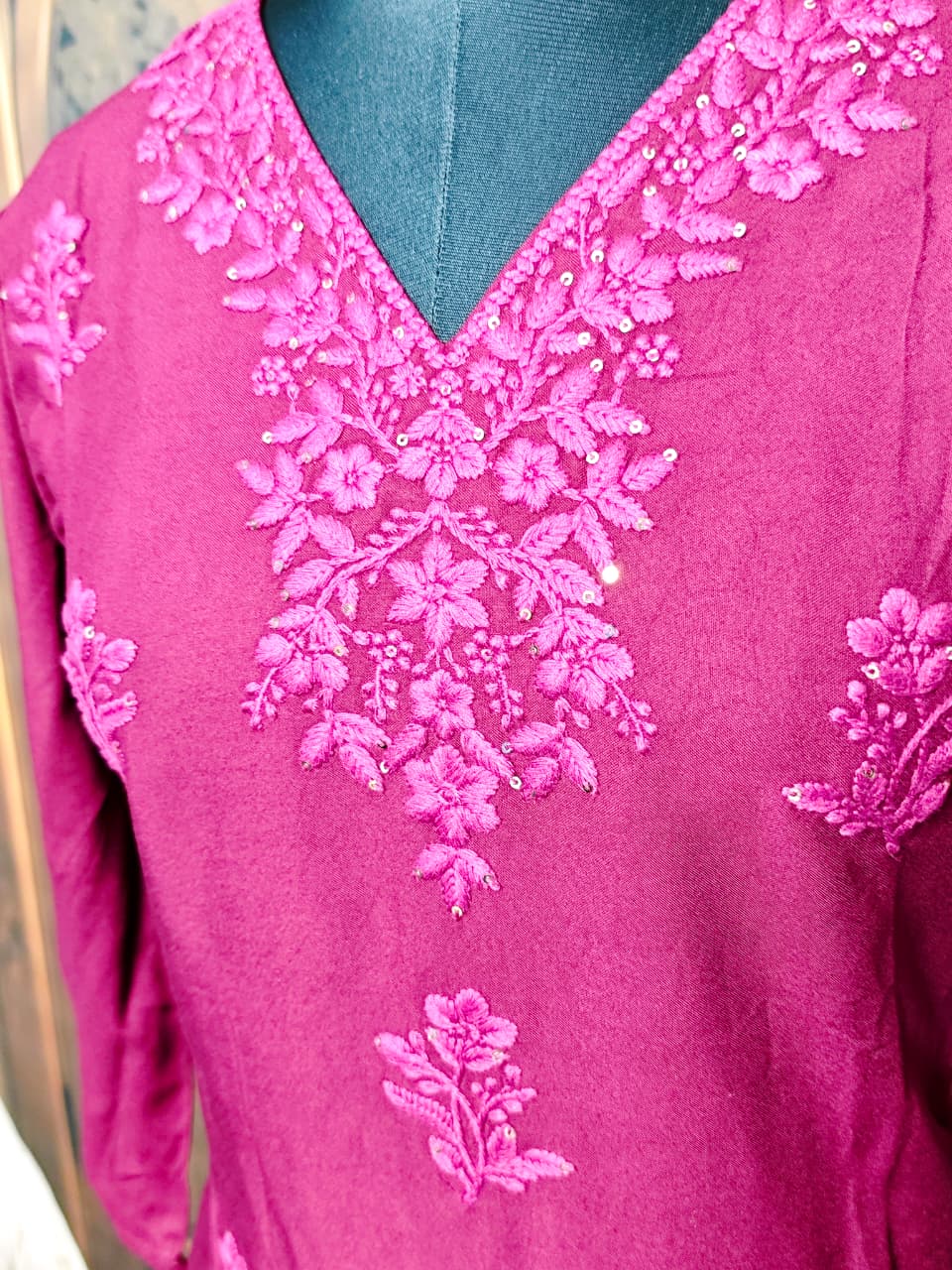 Experience the elegance with this exquisite Chikankari kurti set, meticulously crafted on high-gauge cotton rayon fabric for a luxurious drape and unmatched comfort. The features intricate Mukesh work, where metallic accents are hand-embedded into the floral embroidery to create a shimmering effect that catches the light beautifully. Designed with a sophisticated V-neckline, the kurti showcases heavy tonal embroidery on the yoke and delicate floral butis scattered across the body. The premium rayon material ensures the garment remains breathable and durable, making it perfect for both festive celebrations and formal gatherings.